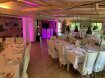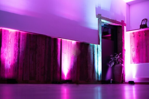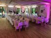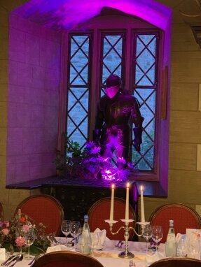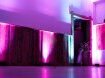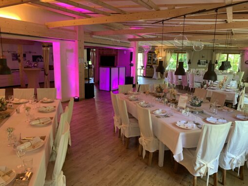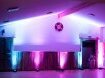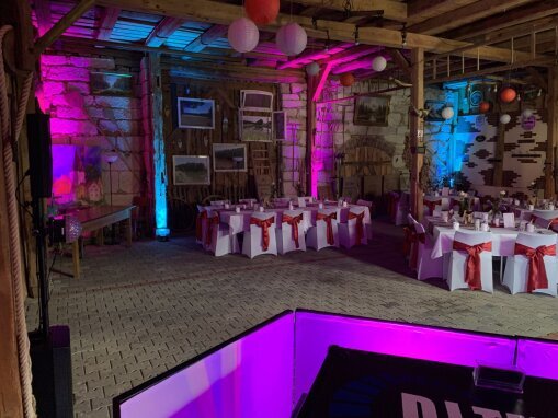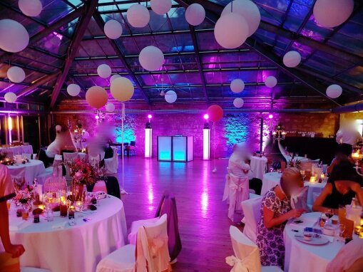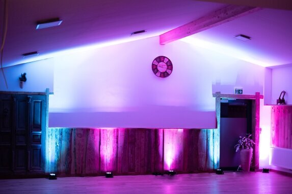 Wohlfühlatmosphäre im Saal, getaucht durch absolut romantisches Licht mit dem Ambiente-Lichtpaket "Floorspot Set" in Euren Hochzeitsfarben.